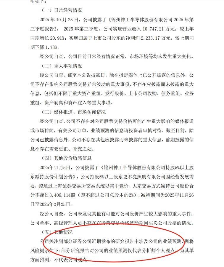 11月11日晚间,神工股份公告表示部分证券公司近期发布的研究报告中涉及公司的业绩预测,部分研究报告对公司的业绩预测仅代表分析师个人观点,为其单方面预测,不代表公司观点。